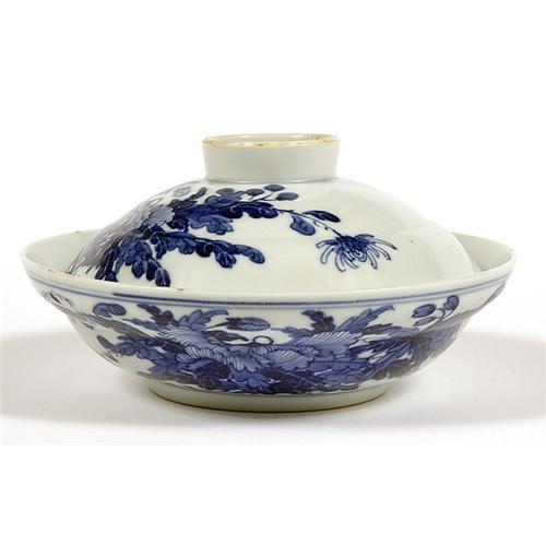 <Our item number 140778><B>Blue and White Flower Bowl with Cover, 1662-1722, Qing Dynasty.</B> Height, 3 1/4 in. x 6 1/4 in. diameter. The clay of this bowl is very light and thin. The glaze is see-through white with floating blue. This bowl with cover is a rare piece in "kang-xi" Qing dynasty. <BR>Estimated Value $5,000 - 6,000. <BR><BR>Our item number 140778<BR><IMAGES><P ALIGN="CENTER"><IMG SRC="http://www.goldbergcoins.net/liveauction/49jpegs/140778.jpg"> </P></IMAGES>