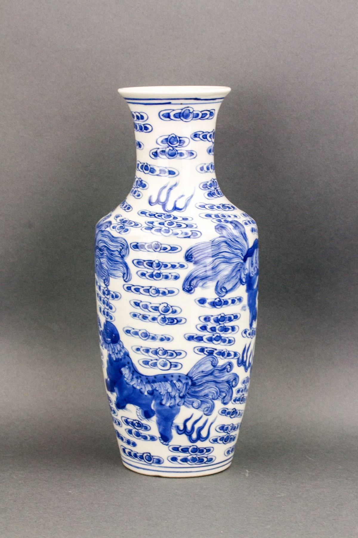 Chinese blue and white porcelain vase; of ovoid body with waisted neck; painted lions playing ball and circle pattern; double ring mark on base; H: 24 cm, D: 12 cm, 621 grams