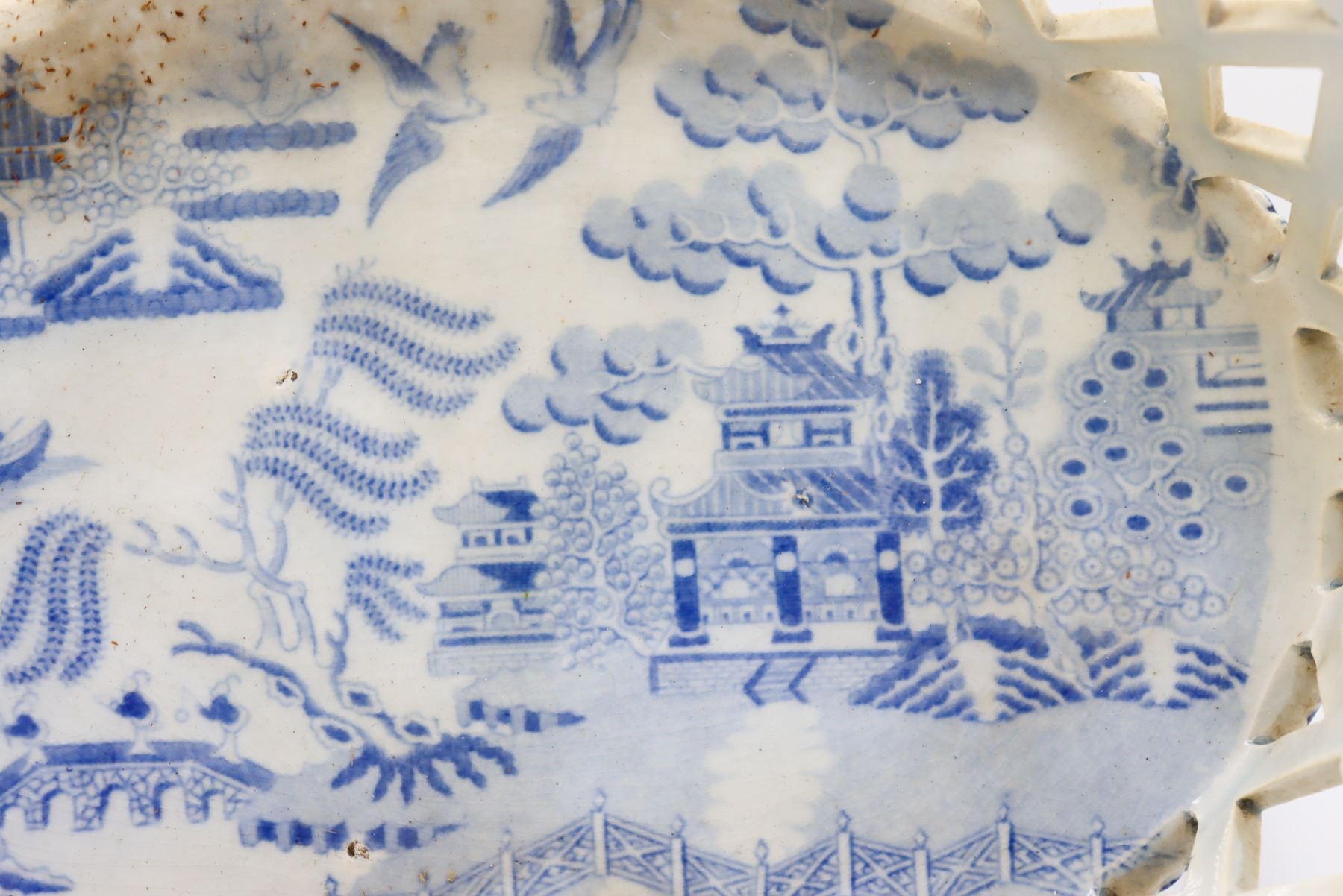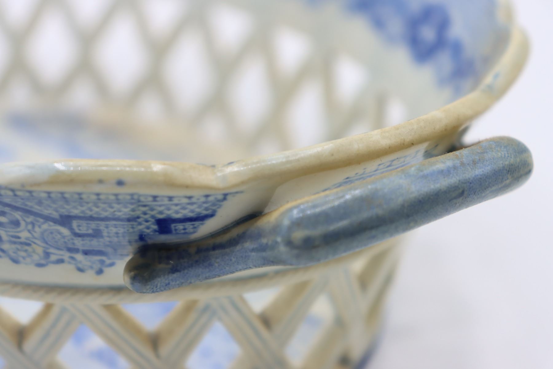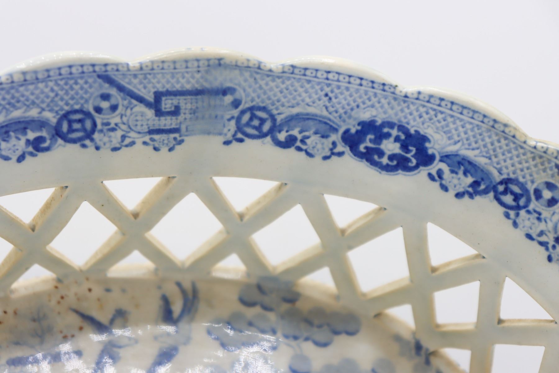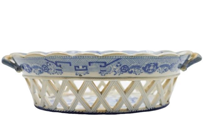 Blue and white porcelain bowl with open weaving throughout. Measurements: 3 x 11 1/2 x 7 1/2 in.