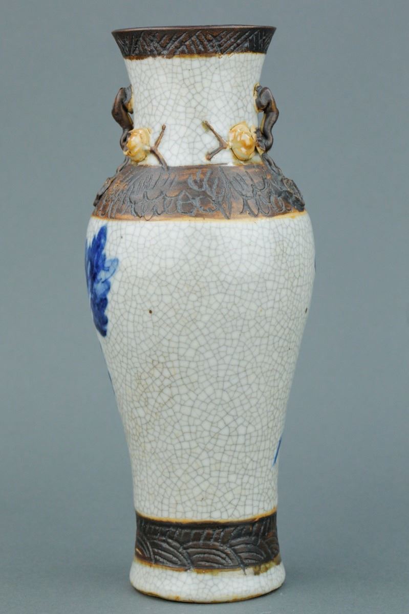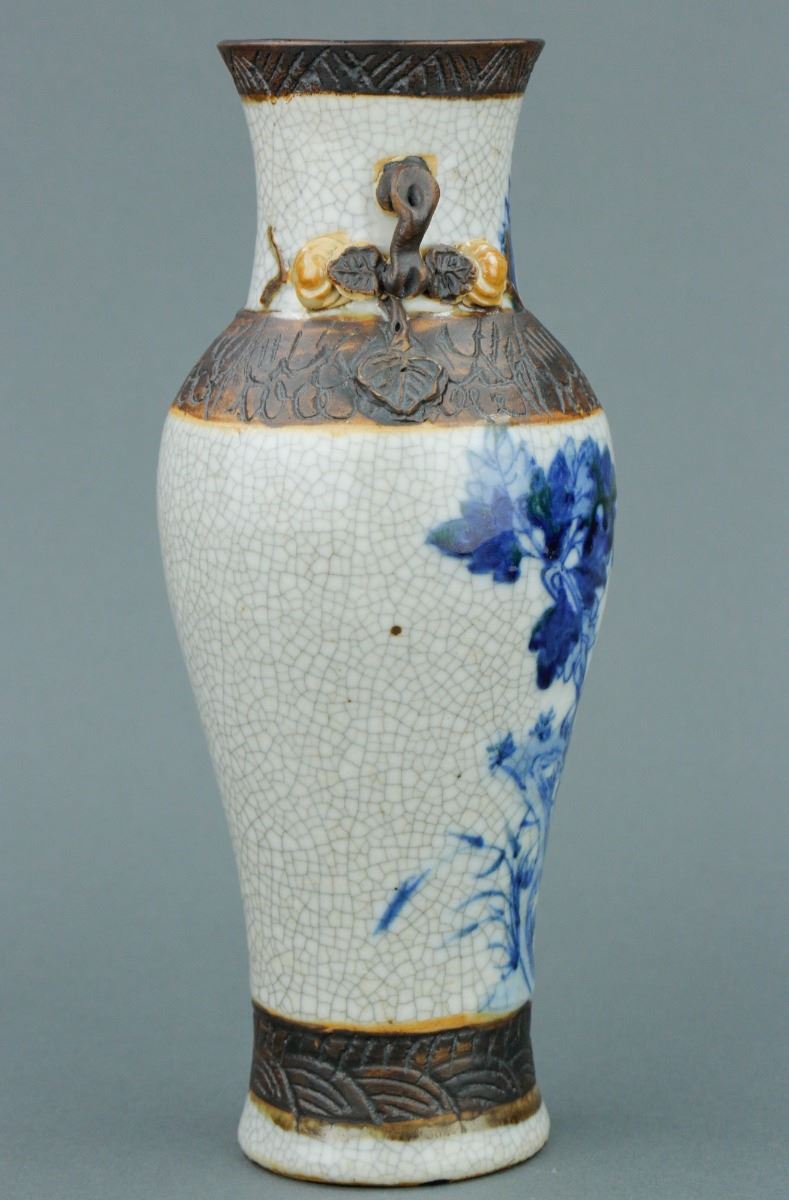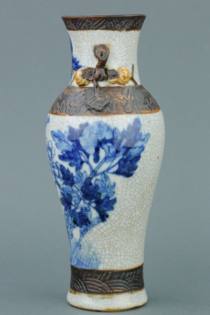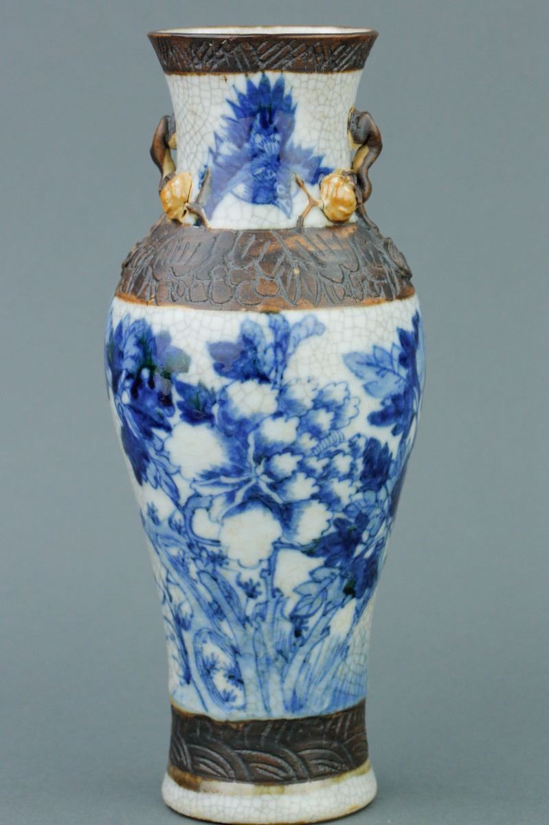 Chinese crackle glaze brown porcelain vase; with slender waisted body and high-shoulders; with two peach handles on slightly waisted neck; featuring peonies in blue and white on body; four-character mark on base;