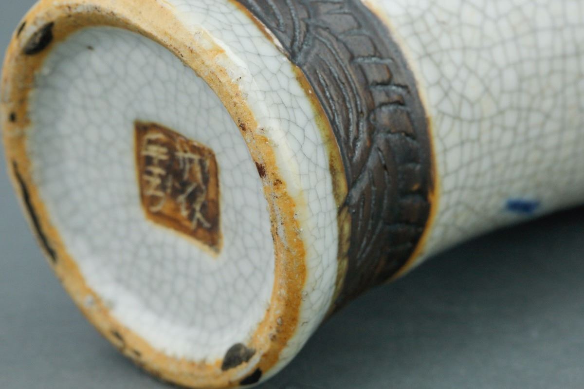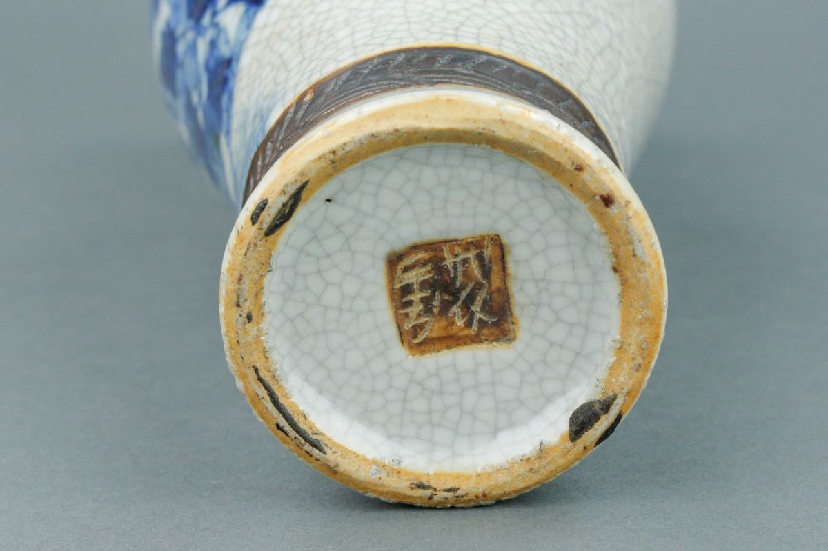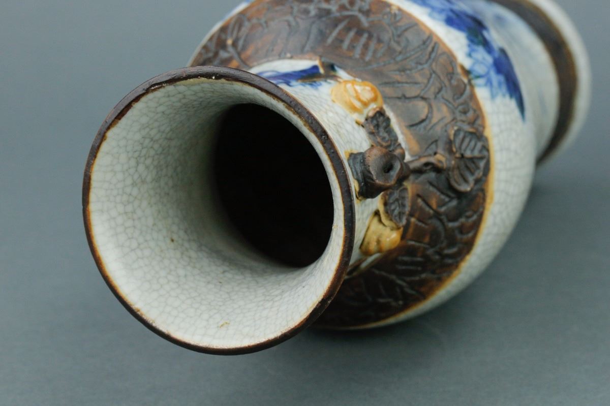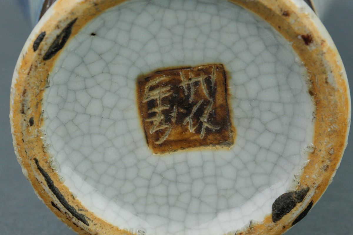 Chinese crackle glaze brown porcelain vase; with slender waisted body and high-shoulders; with two peach handles on slightly waisted neck; featuring peonies in blue and white on body; four-character mark on base;