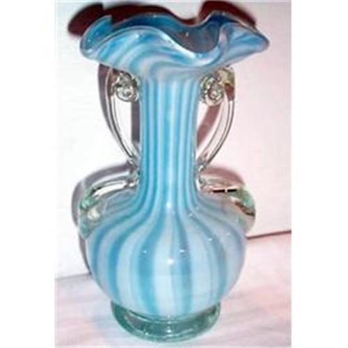 This wonderful Blue and White Striped Hand Blown Art Glass Vase has wonderful applied crystal handles and is in SUPERIOR condition with no chips, cracks, or dings. It measures 3" in diameter and stands a very stately 5.75" tall. Not certain of the maker.