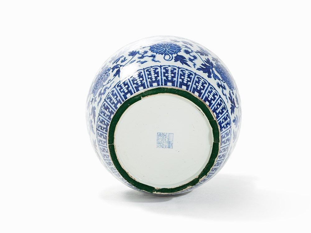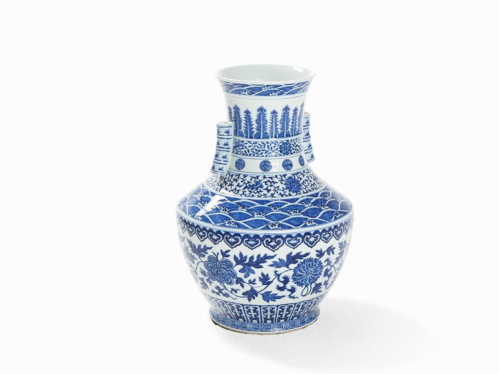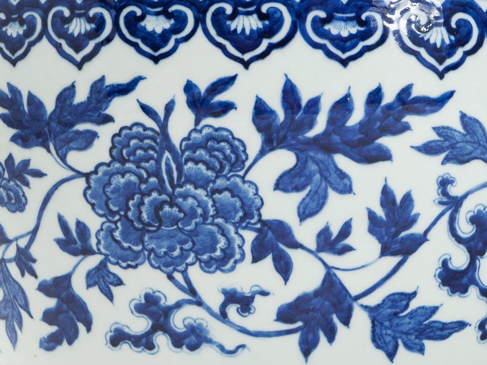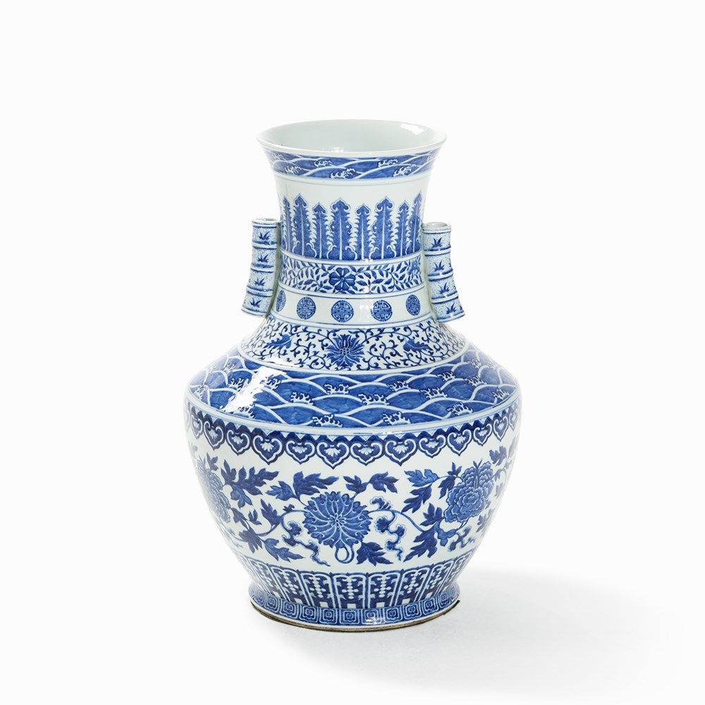This superb large vase demonstrates the fine quality and elaborate underglaze painting typical of the porcelain from the reign of one of the Qing dynasty's greatest patrons of the arts – the Qianlong Emperor. During his reign vases of this form were made with both straight and flared necks whereas the form with flared mouth – as seen in the present piece – appears to have been preferred by the Emperor. It is also found amongst monochrome porcelains of this period. The floral decoration is clearly inspired by the underglaze cobalt floral scrolls on early Ming porcelains. Qianlong vases of this type were generally produced at the imperial kilns at Jingdezhen and delivered to the emperor in pairs.