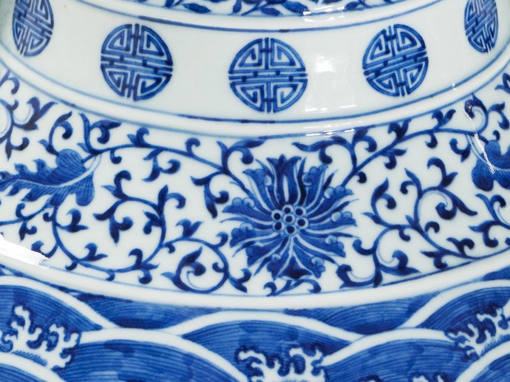 Neck with further ornamental tendrils and bands with shou characters underneath a border of lappet-shaped leaves