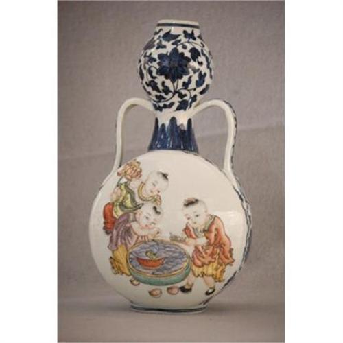blue and white with famille rose flat porcelain bottle with two handle.decor with children playing. good condition.