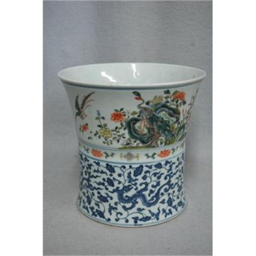 Chinese blue and white with famille rose porcelain pen holder. Decorated with birds and floral.Very unique.Good condition. 8.25" x 8".