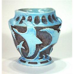Blue and brown glazed Burleighware Art Deco vase, moulded with a band of flying geese, marks to base, 22cm high