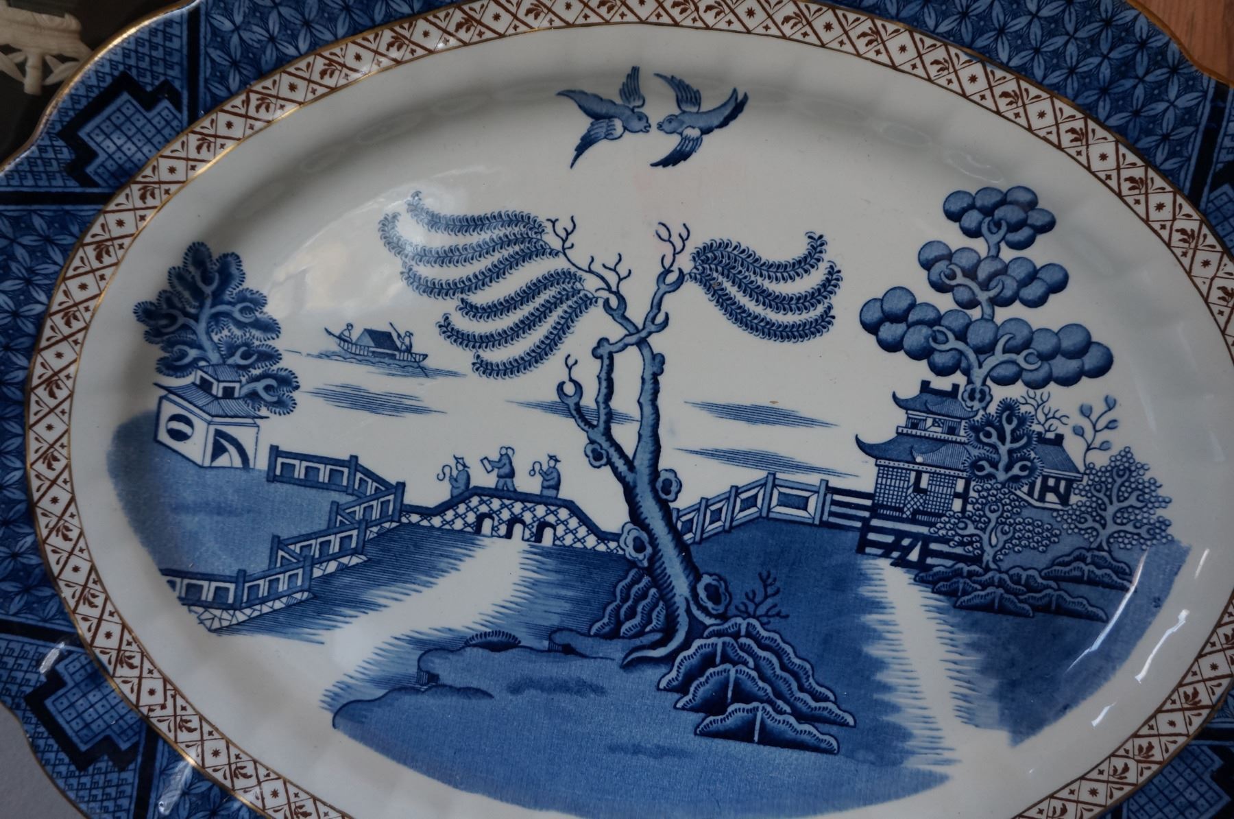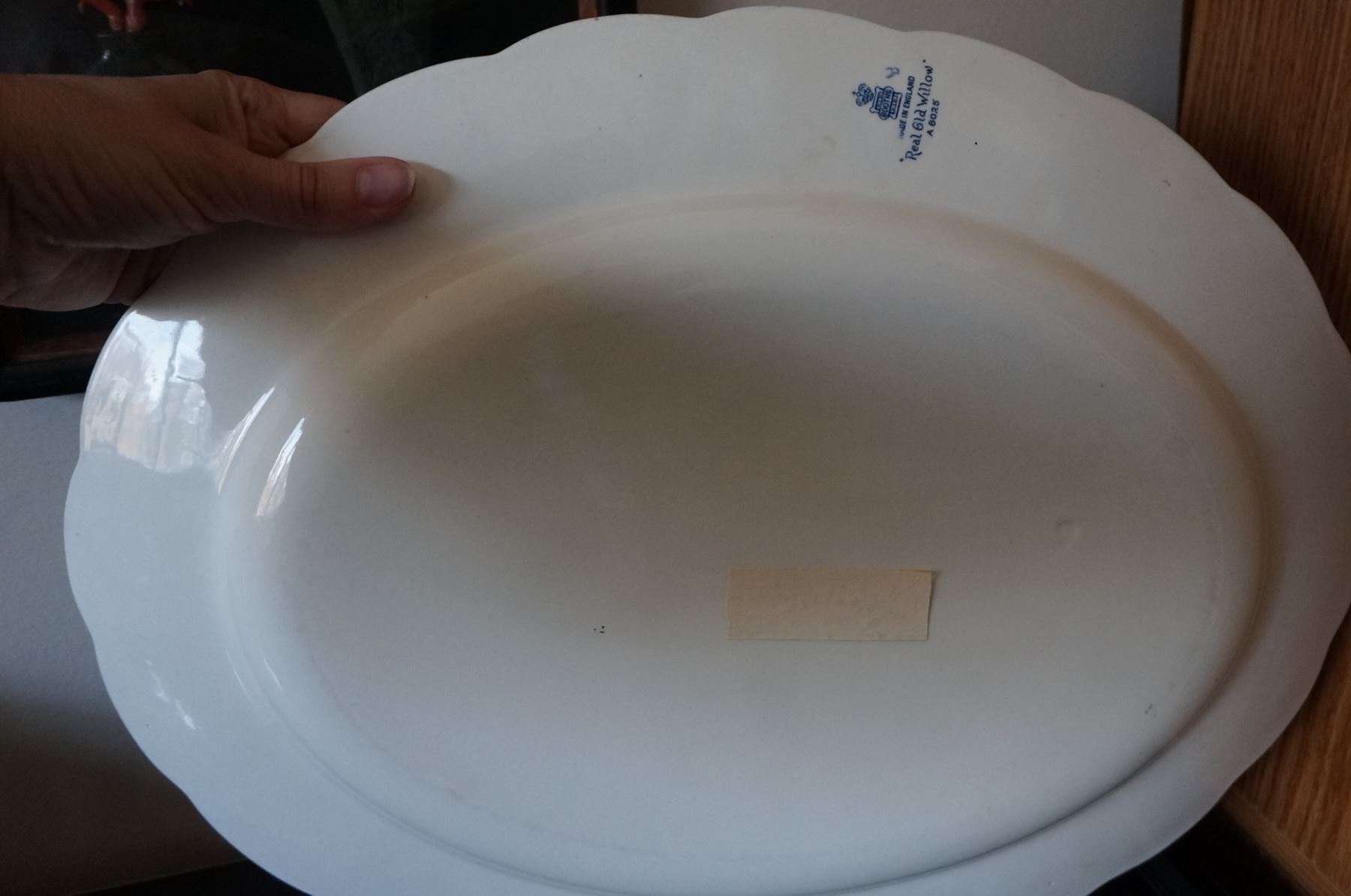 Large blue and white porcelain tray with asian traditional decor, made in England "Real Old Willow"A802518 x 14 inch, very good vintage condition
