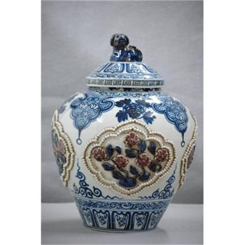 Blue and white with iron red porcelain vase.decor with relief of flowers.good condition.