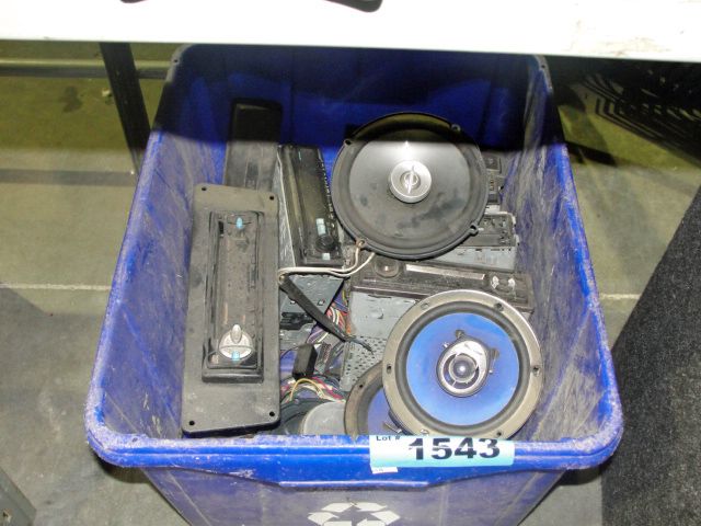 Blue bin of assorted car stereos, speakers, amps