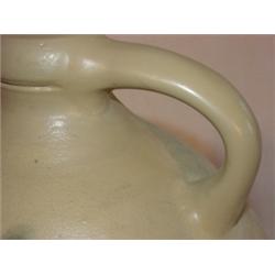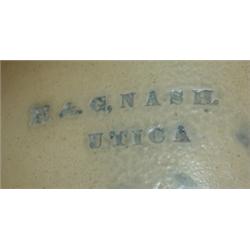 Blue decorated ovoid stoneware jug. Measures 12" tall and has restored handle and sm. star shaped hairline crack to body. Stamped "H. & G. Nash-Utica".