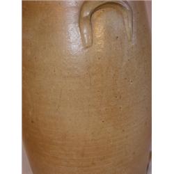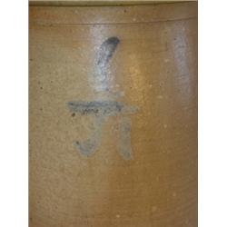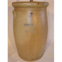 Blue decorated stoneware butter churn. Ceramics measures 18" tall and has one chip to base and wear to inner rim and has 8" line to body.