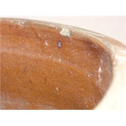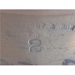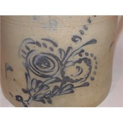 Blue decorated stoneware crock with ears stamped "F.T. Wright & Son-Taunton, Mass." Measures 9 1/4" tall and has one chip to rim and is overall in good condition.