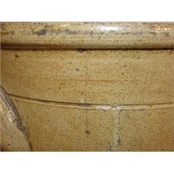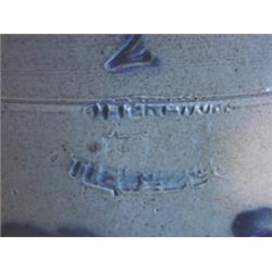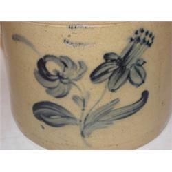 Blue decorated stoneware crock with ears stamped illegibly. Measures 9" tall and has a 4" hairline crack from rim, and one 3" hairline crack from base.