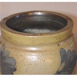 Blue decorated stoneware crock. Measures 9" tall and is in excellent condition.