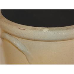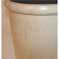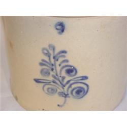Blue decorated stoneware crock with ears. Measures 11 1/2" tall and has a 6" hairline crack and one chip to outer rim and a 4" hairline crack at base. Minor wear to inside of rim.