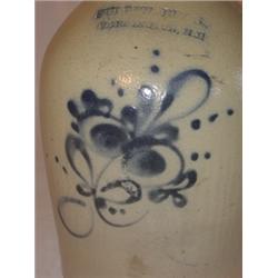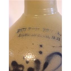 Blue decorated stoneware jug stamped "Fulper Bros.-Flemington, NJ". Stands 10 1/2" tall and has one small Y-shaped firing crack to body.