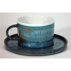 Blue glazed early Troika cup and saucer, marked Troika St Ives to base