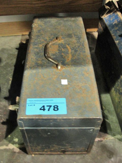 Blue metal tool box with assorted tools