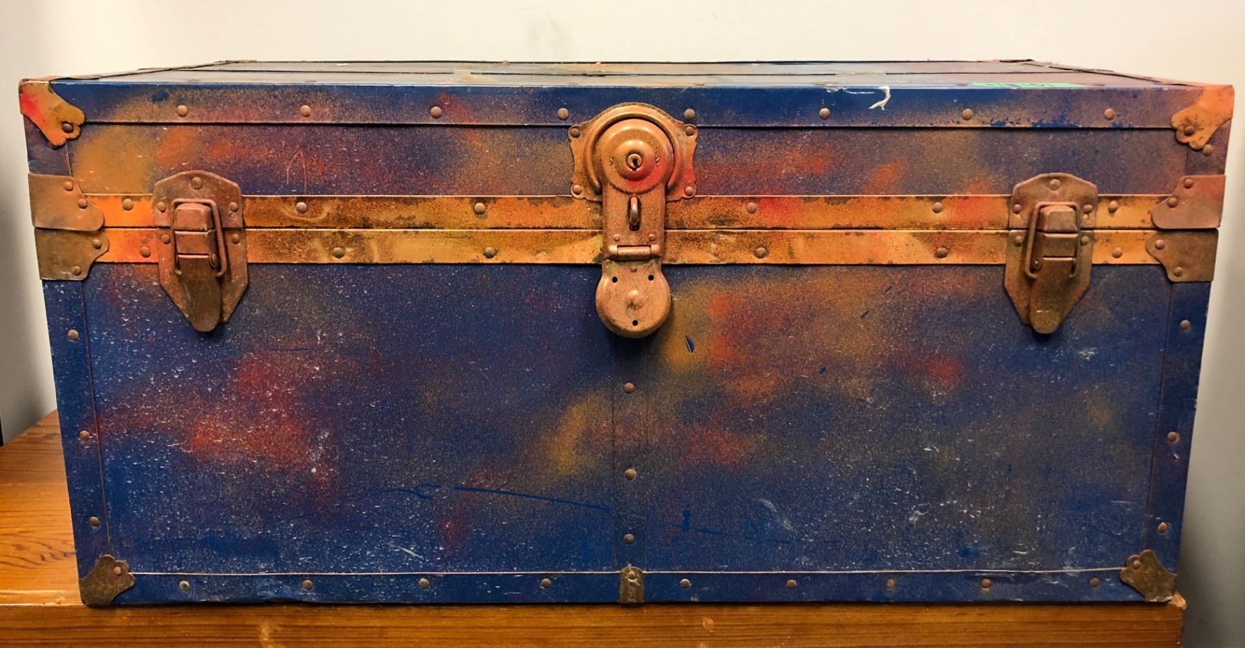 Blue painted metal chest - approx. 34in wide x 16in depth x 16in height