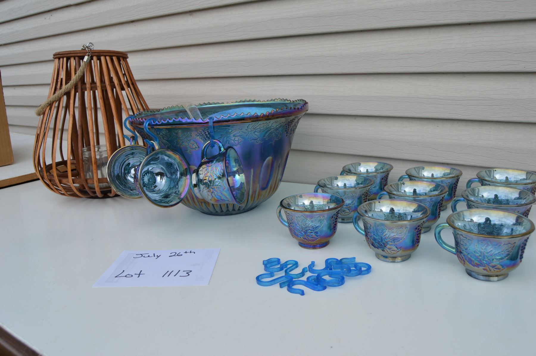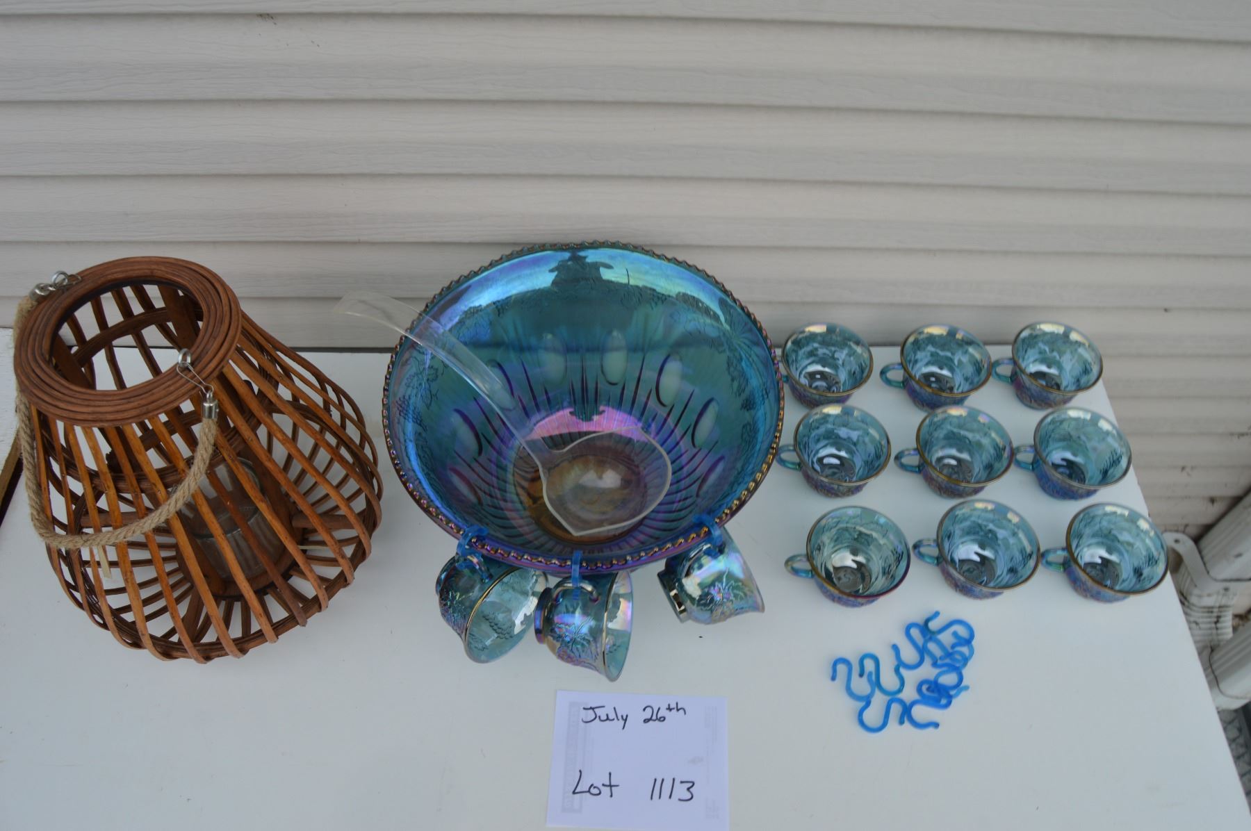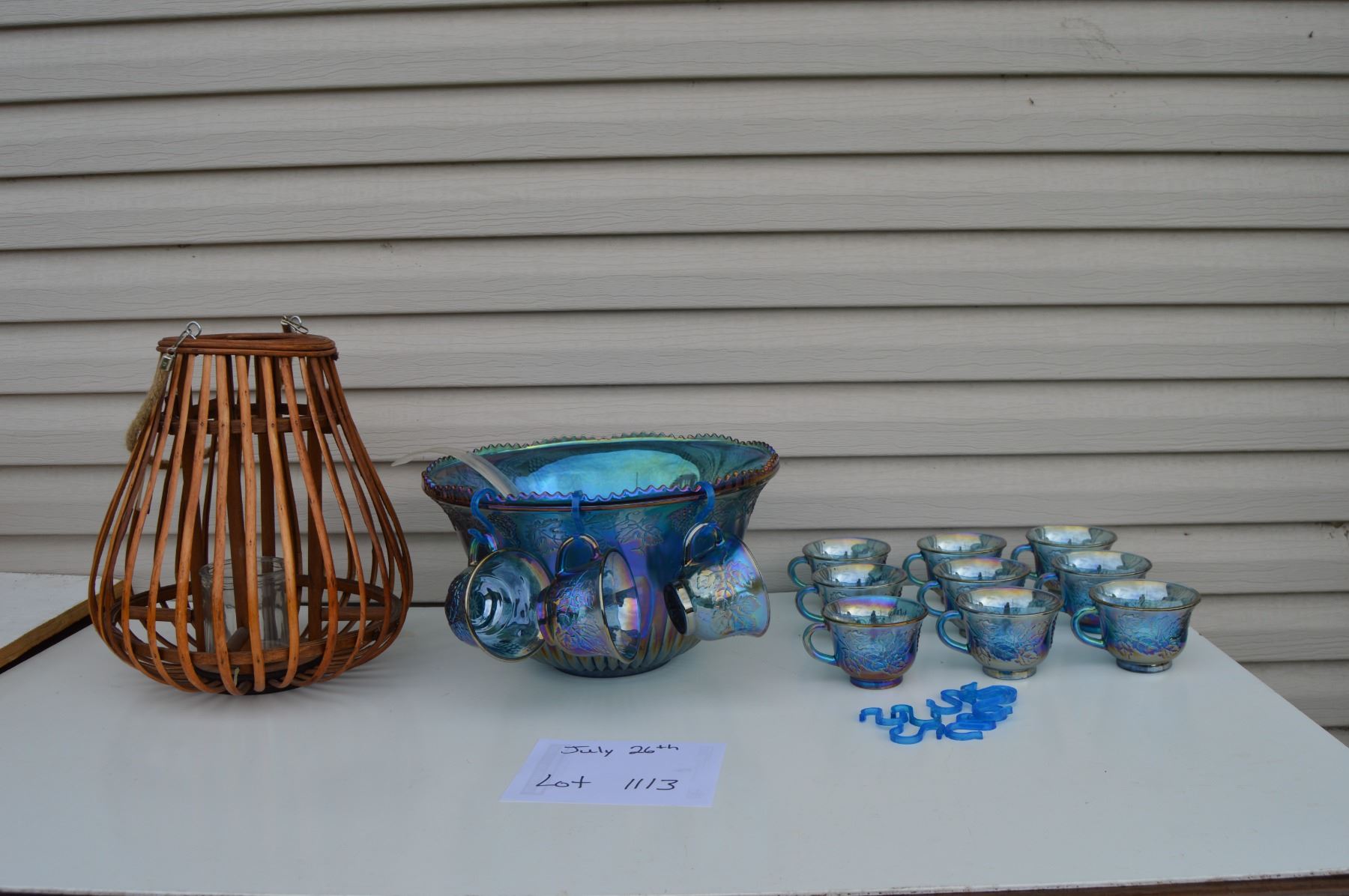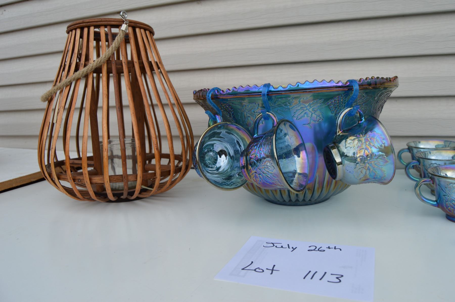 Blue punch bowl with 12 cups / Hanging wicker candle holder