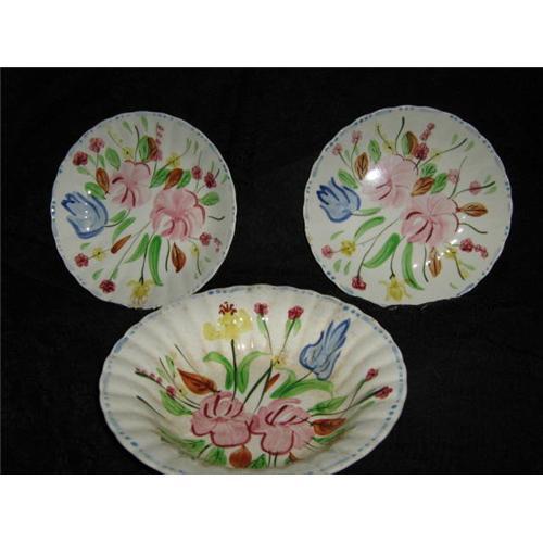 this blue ridge bowl and two salad bowls,is a rare find, good condition a few flea bites small chips.