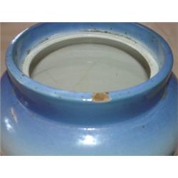 Blue salt-glazed covered cookie jar with lid. Measures 7 1/2" tall and 6" in dia. at top. Has one small chip in outer rim.