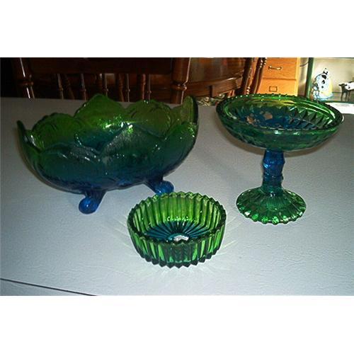 Featuring three separate, decorative, "Flashed-On" crystal items. Small relish bowl, compte, and large 4-footed, scalloped edge, decorative designed bowl. Compote measures 5 3/4 inches tall; opening diameter of 6 inches; depth measures 3 inches; large 4-footed, decorative bowl with scalloped edges measures 9 3/4 inches long by 6 3/4 inches wide; depth of 5 inches; relish dish measures 4 inches in diameter with a depth of 1 1/2 inches; All three items of "Flashed-On Blue to green colors are missing a small amount of the paint. No cracks, chips, etc are seen.