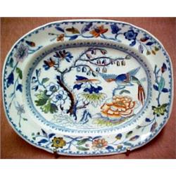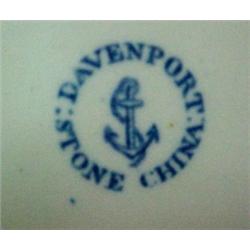 Blue transfer sauce boat with underplate, polychrome overpainting, cobalt with gilt overpainted handle, marked Davenport Stone China, C.1805-20, 6" x 5" x 1 1/2" high on sauce boat, underplate measures 6 1/2" Estimate 80/120