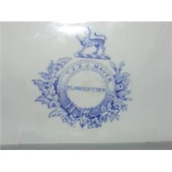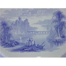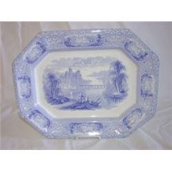 Blue transfer ware meat platter with Arabian river scene decoration. Marked T.J.X.J. Mayer Florentine on back. 15 3/4" wide.