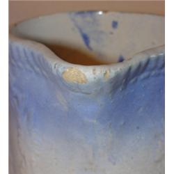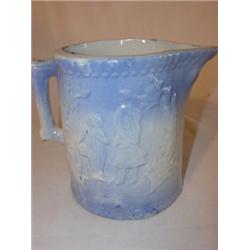 Blue & white salt glazed stoneware pitcher with embossed Victorian girl & boy design. Stands 6" tall and has several small chips to rim and two chips to spout.