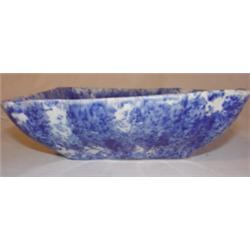 Blue & white spongeware 4 sided bowl. Measures 8" x 8" and has one chip to rim and sits unevenly.