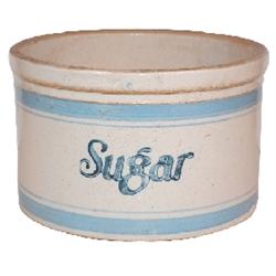 Blue & white stoneware "Sugar" crock, 3 small base chips & 6" hairline on side, otherwise Exc., 11.5"Dia. x 7.5"H.
