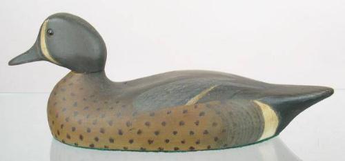 Blue wing teal drake by the Wildfowler Decoy Factory in Old Saybrook, CT. In XOC in all respects with minor dings. Like the one on page 31 in the Wildfowler Dcoy Book by Cowan and LaFountain. No keel. Felt on the bottom. Painted in the 1939 style. Nice patina. (decoy)