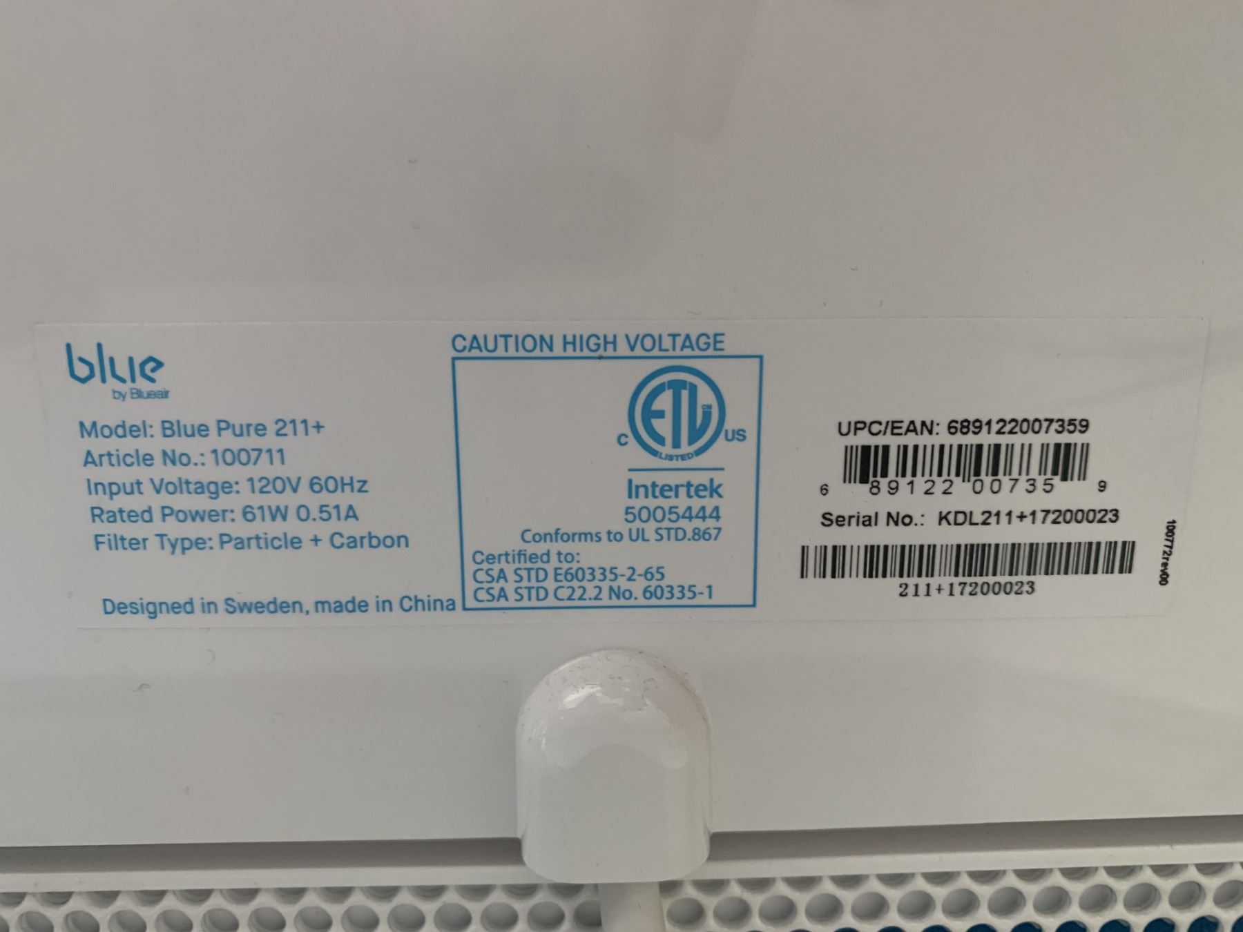 Blueair "Blue" Air Purifier (Model: Blue Pure 211+)