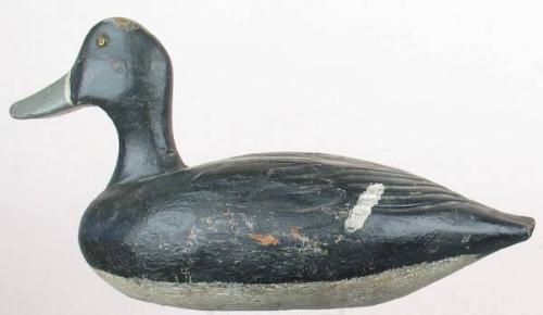 Bluebill drake decoy from Quebec with heavy relief wing and tail carving. Glass eyes and a high head posture. Nice old working paint , struck by a few shot. (decoy)