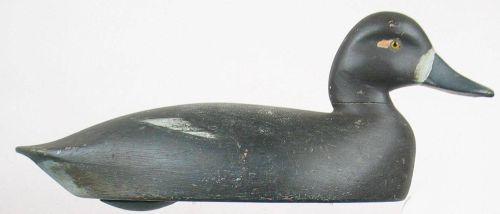 Bluebill hen decoy from upstate NY in good working paint, some original, with a few surface rubs and chips to area near the eyes. Struck by shot. Grain painting on the back and on wing flashes appears to be original. Provenance: Pitt Collection.