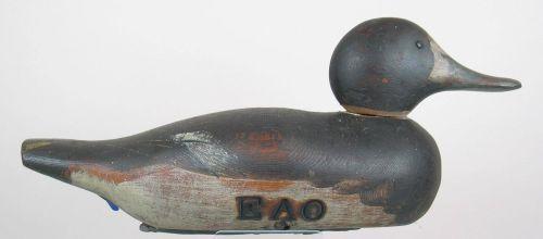 Bluebill hen decoy with "EAO branded on the lower right side attributed to the Dodge Factory. Good OP with some average wear. Filler missing from neck, tack eyes and nice wide bill. Few narrow checks, knots with flaking. Provenance: Pitt Collection.