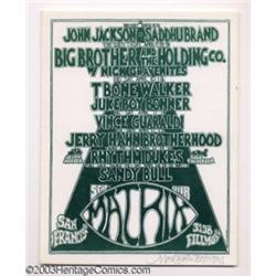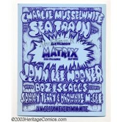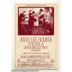 Blues Assortment - Miscellaneous Music Memorabilia, Handbills (various). A batch of five different handbills that feature greats of the Blues. The first is B. B. King in Vancouver, B.C. on November 5th 1974. It is NM and measures 5.5" x 8.5". The second is a circular shaped postcard from the Retinal Circus in Vancouver, B.C. featuring Muddy Waters. It is 7" across and is NM. Next is John Lee Hooker at the Hayward Theatre in Hayward, California on February 13, 1972. It's NM, signed by artist Mark Twain Behrens, and measures 4.75" x 7.25". Up next is the April, 1970 Matrix calander that features T. Bone Walker. It is signed by Mark Twain Behrens. Last, but not least, is the March, 1970 Matrix calander which features Charlie Musselwhite, John Lee Hooker, Sonny Terry, and Brownie McGee. It is signed by Mark Twain Behrens, is NM, and measures 5.5" x 7". This is a lot that won't give you the blues, as long as you're the high bidder. ***** 5 items Important notice: Heritage usually auctions material at the rate of 200-250 lots per hour. On some occasions eBay Live bid software or the Internet may not be able to keep up with the pace of the auction. We recommend placing a realistic absentee bid now as insurance to avoid disappointment. Occasionally the auctioneer may eliminate or reject an eBay Live bid, and the auctioneer may also reopen a lot after the close of the eBay live bidding (usually because we missed an audience bid), and may reject your bid even if it shows you as the winning bidder. By bidding via eBay Live, you agree that Heritage may award the lot to another bidder at its sole discretion under the circumstances described above or any other reasonable circumstances. Also please note that all Heritage lots purchased through eBay Live carry a 20% Buyer's Premium. Please make sure you read the Terms and Conditions before you bid.