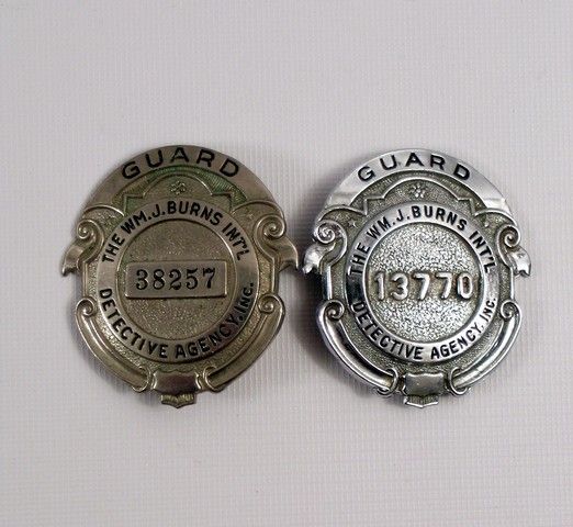 Blues Brothers Detective Badges Props - From the original Belushi/Aykroyd mega-feature "The Blues Brothers" (1980) comes these two Wm. J. Burns International Detective Agency Guard Badges. `The use of this real Detective Agency which closed in 1932 was an in-joke being that William J. Burns (who started as director of the BOI, a predecessor of the FBI) was notorious as a union buster, and basically a man who with his organization would allegedly take money to track down anyone, or cause any kind of trouble you wanted. The two metal Detective Agency badges are approx. 2 1/2" x 2 1/2".
