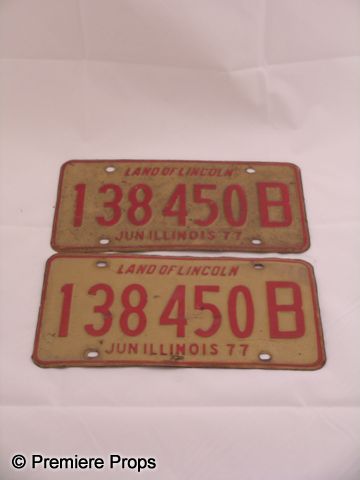 Own two vintage license plates that were used in the production of 'The Blues Brothers', the 1980 comedy starring John Belushi and Dan Aykroyd as the two musicians. The brown and red plates show some wear from being on set, including discoloration and rust. They read: "Land of Lincoln. 138450B. Jun Illinois 77." (Measures approx. 12" x >0.25" x 6" ea.)