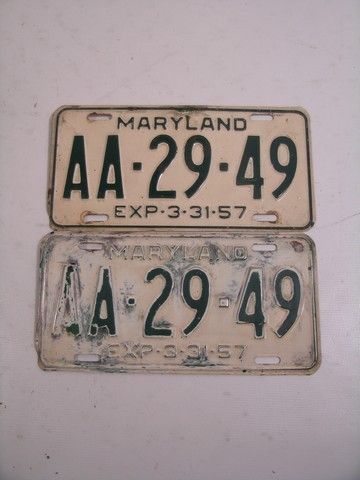 From the set of the 1980 musical comedy 'The Blues Brothers', starring John Belushi and Dan Aykroyd. These are a pair of white and green license plates read, "Maryland. AA-29-49. EXP 3-31-57." One plate shows light wear, while another displays moderate wear from being used on set. (Measures approx. 12" x >0.25" x 6" ea.)