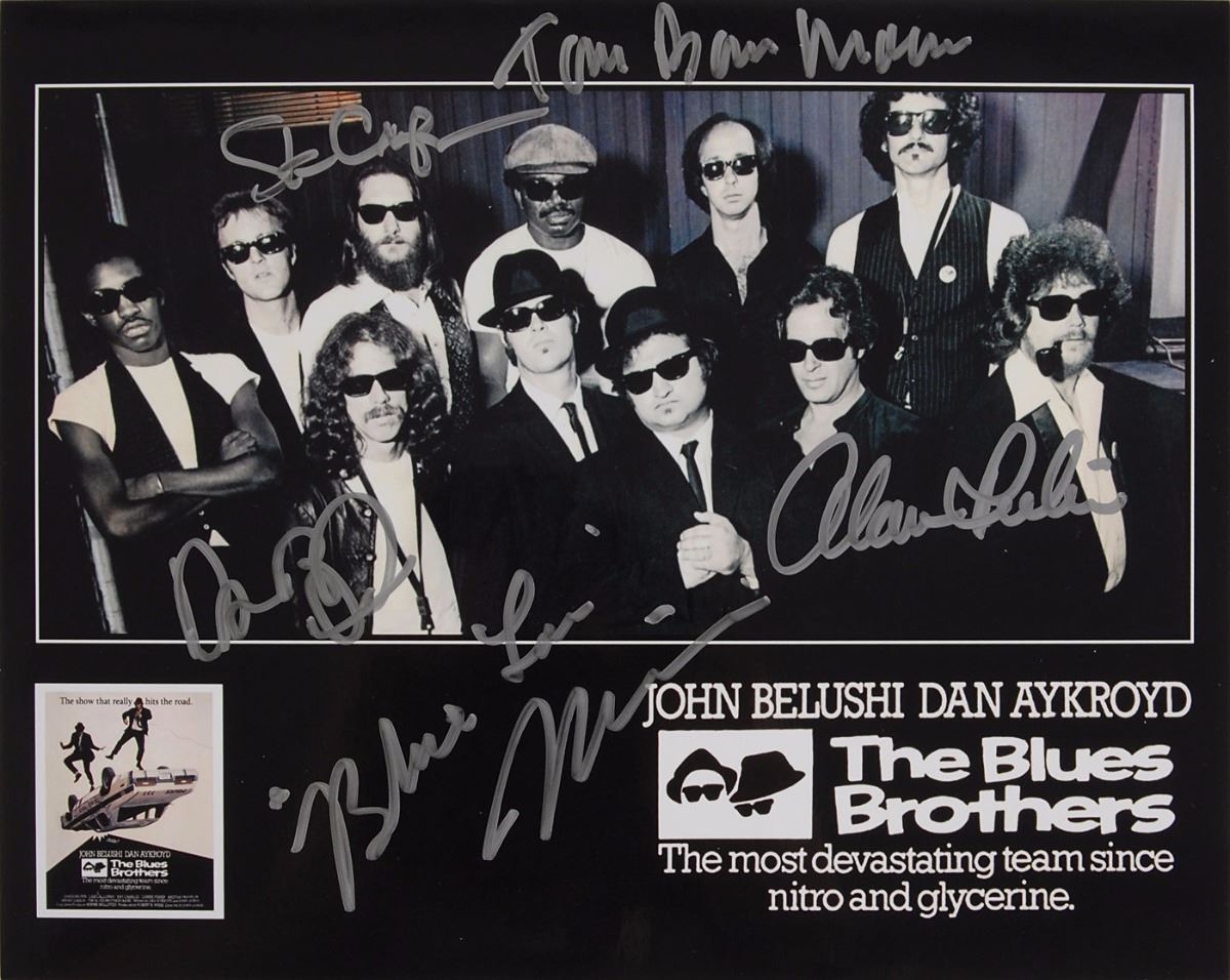 Glossy 10 x 8 photo of the Blues Brothers band from the eponymously titled 1980 musical comedy, signed in silver ink by Steve Cropper, Tom ‘Bones’ Malone, ‘Blue’ Lou Marini, Alan Rubin, and Dan Aykroyd. In fine condition.