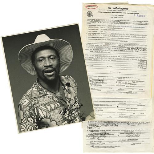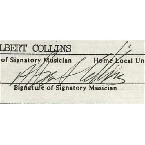 <B>Blues Greats Autograph Lot.</B></I> Includes a b&w 9.5" x 11.5" photo signed by Taj Mahal in black Sharpie; a contract dated April 18, 1985, and signed twice by Robert Cray in black ink; and a contract dated April 24, 1985, and signed twice by Albert Collins in black ink. In overall Excellent condition with light wear. <I>Accompanied by LOA from PSA/DNA.</B></I> <BR><BR><B>Important notic