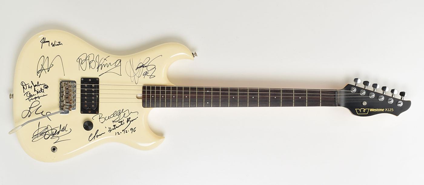 Fantastic cream-bodied Westone X125 electric guitar, signed on the body in black felt tip by B. B. King, Bo Diddley, Buddy Guy, Clarence 'Gatemouth' Brown, Johnny Winter, Robert Cray, Leon Russell, Dr. John, and Johnny Lang. In fine condition, with one string broken and wear to the tremolo arm grip. A wonderful guitar signed by nine blues legends.