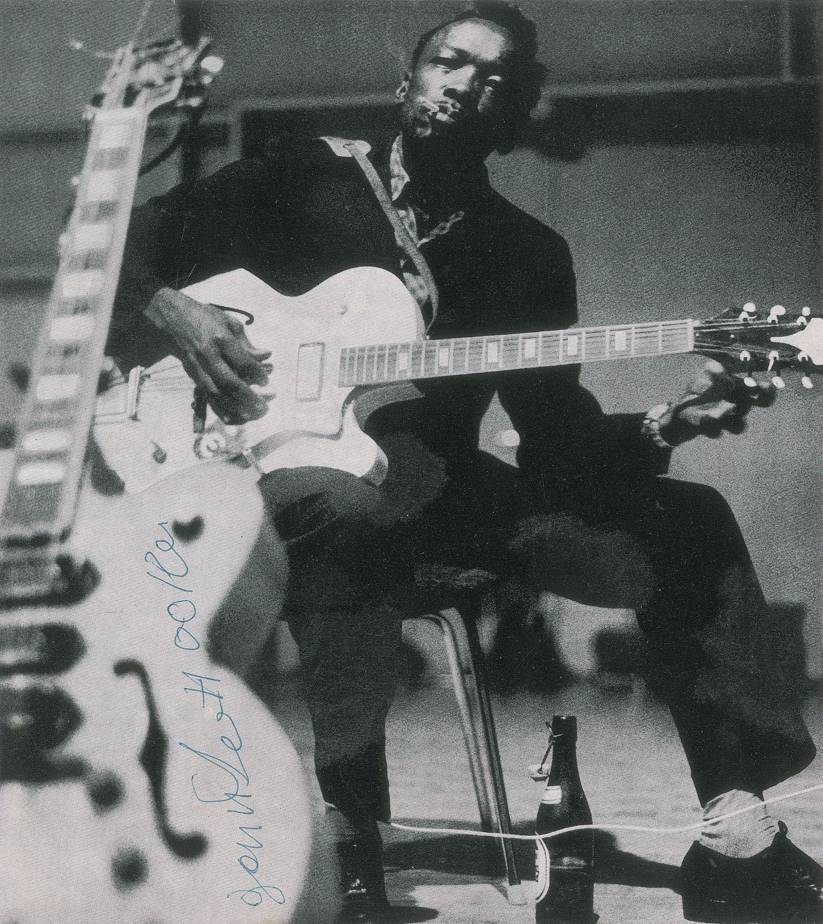 Appealing set of three photos removed from an American Folk Blues Festival program, each featuring images of a legendary blues musician of the past, including: a 9 x 10 photo of John Lee Hooker smoking and tuning his guitar, signed vertically in black ink by Hooker, with the reverse signed in blue ballpoint by T-Bone Walker; a 9 x 10 photo of Big Joe Williams seated with his guitar, signed in black ink by Williams; and a 10.75 x 9 photo of Eddie Taylor playing the guitar and smoking a cigarette, signed in black ink by Taylor. In overall fine condition, with some light creasing.