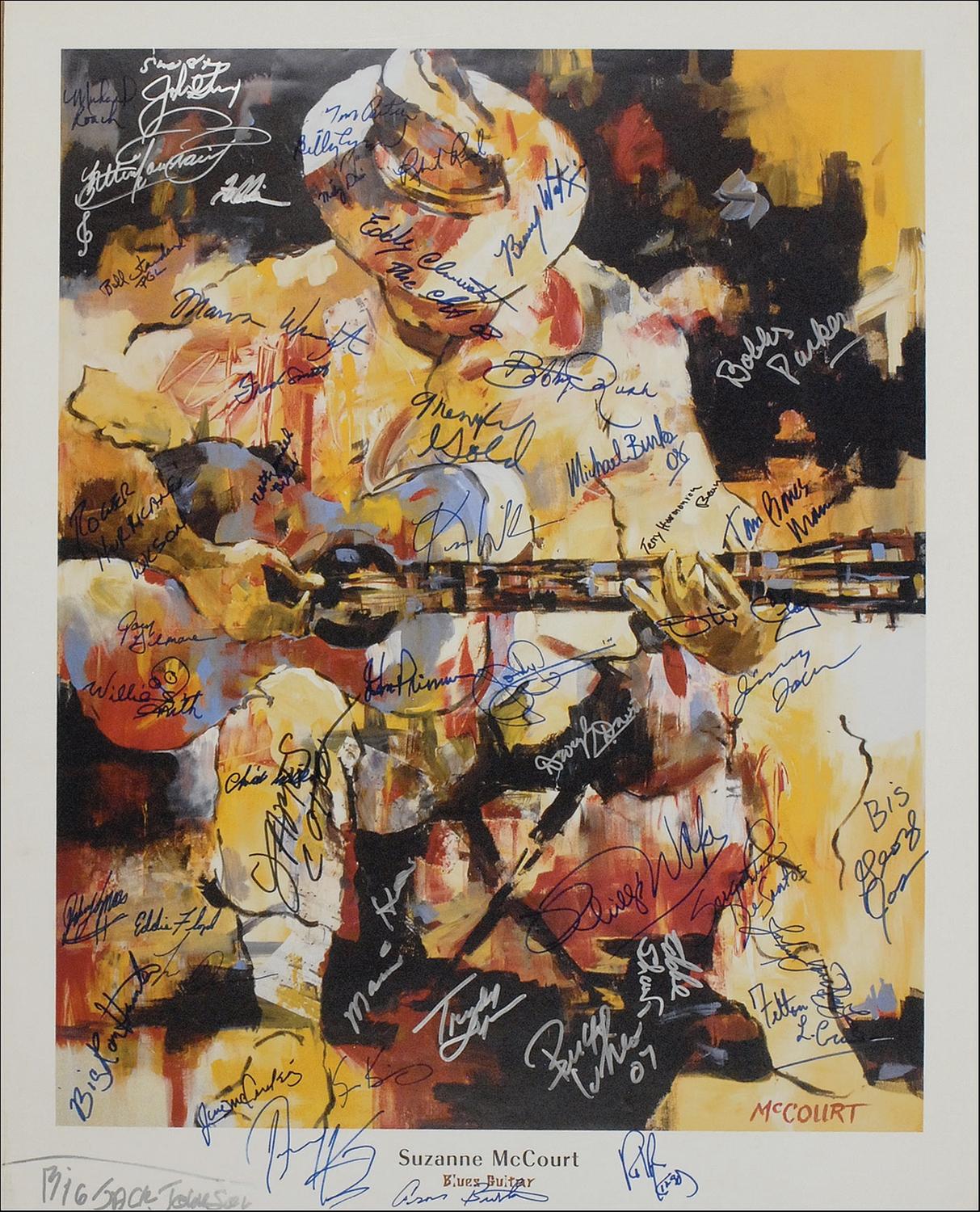 Color 27 x 34 print entitled ‘Blues Guitar,’ signed in ink and felt tip by 46 blues legends and greats. Signers are: James Cotton, Bobby Rush, Jimmy McCracklin, Big Jack Johnson, Eddy 'The Chief' Clearwater, Phillip Walker, Sugar Pie De Santo, Willie "Big Eyes" Smith, Bobby Parker, Jimmy Johnson, Jody Williams of Howlin Wolf, Eddie Shaw, Aron Burton, Allen Toussaint, Marva Wright, Johnny "Yard Dog" Jones, Buckwheat Zydeco, Kim Wilson of The Fabulous Thunderbirds, John Primer, Beverly Guitar Watkins, Otis Clay, Tom Bones Malone of The Blues Brothers, Chick Willis, Memphis Gold, Terry Harmonica Bean, Michael Burks, Trudy Lynn, Big Ron Hunter, Joey Gilmore, Michael Roach and Johnny Mars, Lil Dave Thompson, Big George Jackson, The Kinsey Report’s Ralph Kinsey, Kenneth Kinsey and Donald Kinsey, Pittsburgh Gospel Lights including Nathaniel Bills, Billy Cyrus, Tim Carter, Bill Standard and Frank Smith, Daryl Davis, Macavine Hayes, Roger ‘Hurricane’ Wilson and Freddie Cunningham of Root Doctor, and Felton L. Cruise. Rolled and in fine condition, with scattered light edge creases and dings.