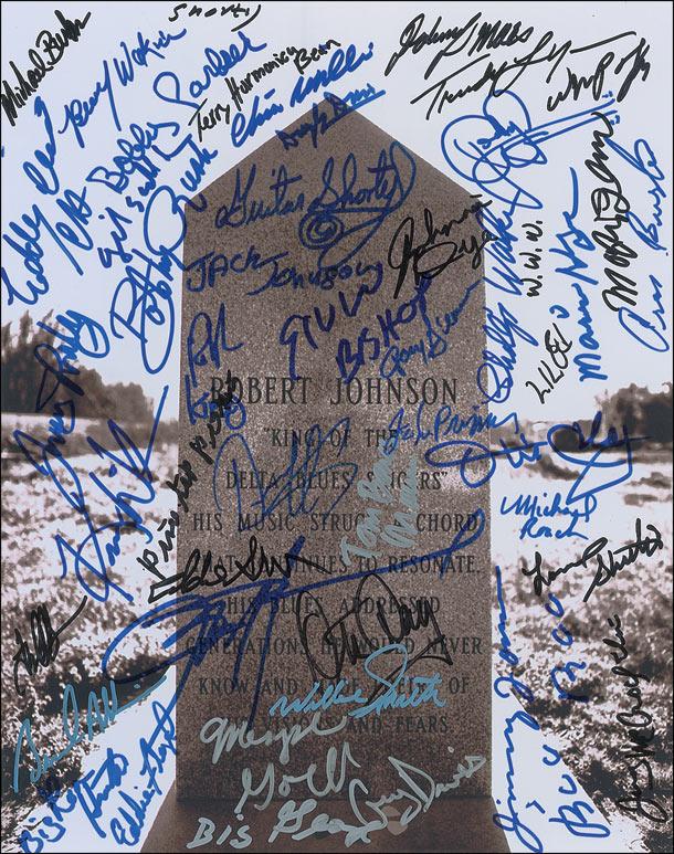 Color satin-finish 11 x 14 signed tribute photo of Robert 'King of the Delta Blues' Johnson’s headstone, singed in ink and felt tip by 47 Blues legends. Signers are: Pinetop Perkins (deceased), Bobby Rush, Jimmy McCracklin, Big Jack Johnson (deceased), Gil Scott Heron, Willie Big Eyes Smith, Elvin Bishop, Guitar Shorty, Eddy 'The Chief' Clearwater, Magic Slim, Phillip Walker (deceased), John Hammond, Walter Wolfman Washington, Bobby Parker, Jimmy Johnson, Jody Williams of Howlin Wolf, Johnnie Dyer, Aron Burton, Eddie Shaw, Lonnie Shields, Kim Wilson of The Fabulous Thunderbirds, Beverly Guitar Watkins, Lil Ed of The Blues Imperials, Boo Boo Davis, Otis Clay, Jimmy Thackery of The Nighthawks, Tom Bones Malone of The Blues Brothers, John Primer, Chic Willis, Memphis Gold, Shorty Gilbert, Terry Harmonica Bean, Bernard Allison, Michael Burks, Trudy Lynn, Big Ron Hunter, Guy Davis, Joey Gilmore, Michael Roach and Johnny Mars, Big George Jackson, Ralph and Donald Kinsey of The Kinsey Report, Daryl Davis, Whop Fraizer, Macavine Hayes, and Freddie Cunningham of Root Doctor. In very fine condition. Accompanied by three matte-finish 4 x 6 photos of Eddie Clearwater, Willie Smith, and Macavine Hayes taken at time of signing.