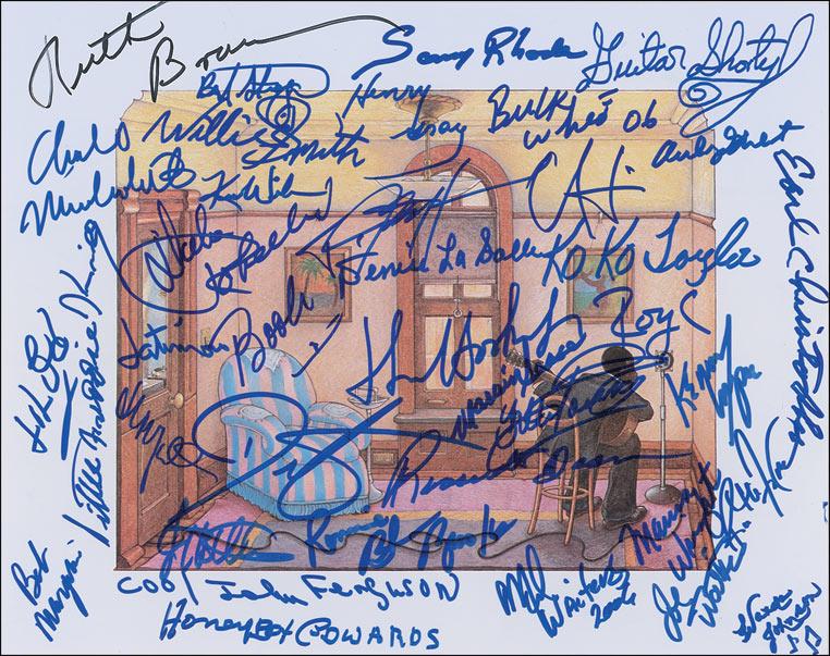 Color glossy 14 x 11 album art photo, signed in felt tip by 37 Blues musicians and legends. Signers are: Ruth Brown, KoKo Taylor, David 'Honeyboy' Edwards, Charlie Musselwhite, John Mayall, Booker T. Jones of Booker T & the MG's, John Hammond, Henry Gray, Willie 'Big Eyes' Smith, Steady Rollin Bob Margolin, Guitar Shorty, Sonny Rhodes, Denise LaSalle, Little Freddie King, Roy C, Bob Stroger, Allen Toussaint, Buckwheat Zydeco, Delbert McClinton, Joe Lois Walker, Jerry Iceman Butler, Latimore, Lil Ed, Mel Waiters, Marvin Sease, Duke Robillard, Roosevelt Dean, Earl Christopher, Kim Wilson of the Fabulous Thunderbirds, John Lee Hooker Jr., Aubrey Ghent, Kenny Wayne, Ruthie Foster, Marva Wright, Corey Harris, Ronnie Baker Brooks, and Wanda Johnson. In very fine condition.