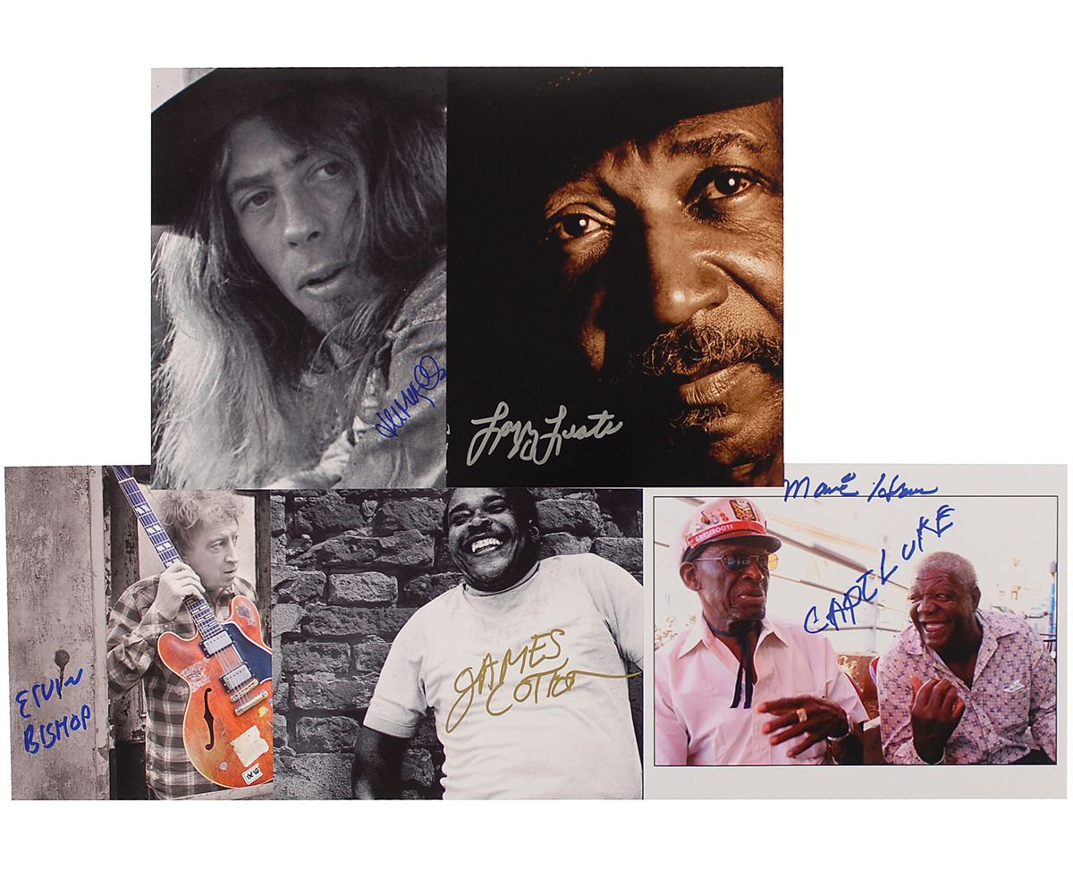 Five glossy and satin-finish photos, three 10 x 8 and two 8 x 10, four color, each signed in ink or felt tip by the respective musician pictured. Signers are: John Mayall, James Cotton, Lazy Lester, Elvin Bishop, and Captain Luke and Macavine Hayes. In fine condition.